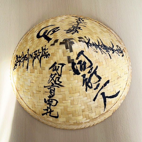 • 帽子 菅笠 正面に弘法大師を表す梵字が入っています。帽子は本堂で脱ぐ必要がありますが、菅笠は被ったままで良いとされています。